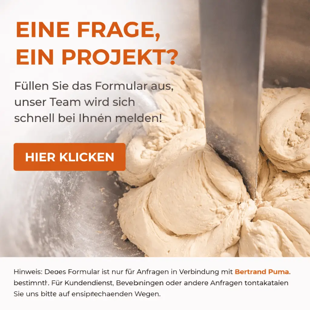 Als offizieller Bertrand Puma Händler unterstützt DEBRACO Fachbetriebe bei der Auswahl leistungsstarker Maschinen wie Knetmaschinen, Teigteiler und weiterer Anlagen für eine effiziente und zuverlässige Teigverarbeitung.